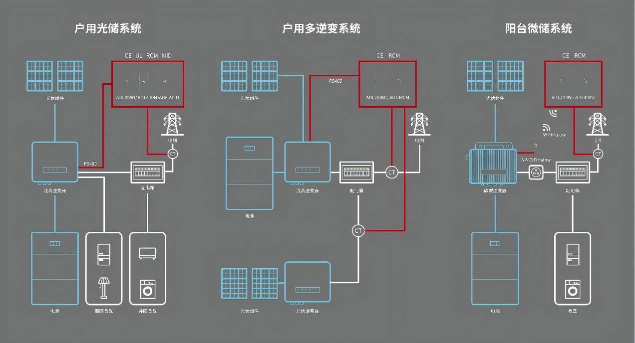 ADL200W/400W, şebeke bağlantı akımını gerçek zamanlı olarak izleyerek, şebeke uyumluluğunu sağlamak için invertörlerle koordineli olarak hızlı akım sınırlamasına olanak tanır.