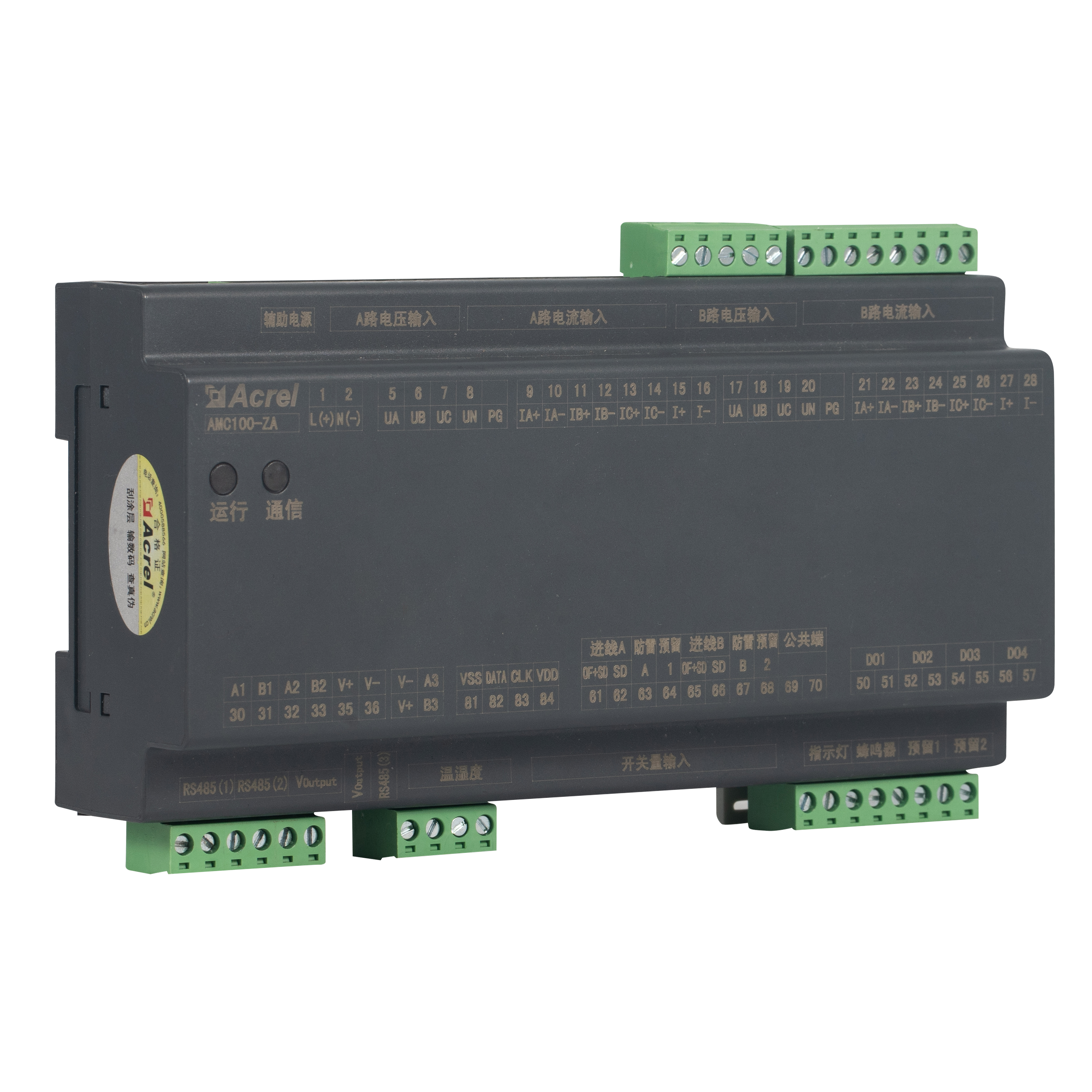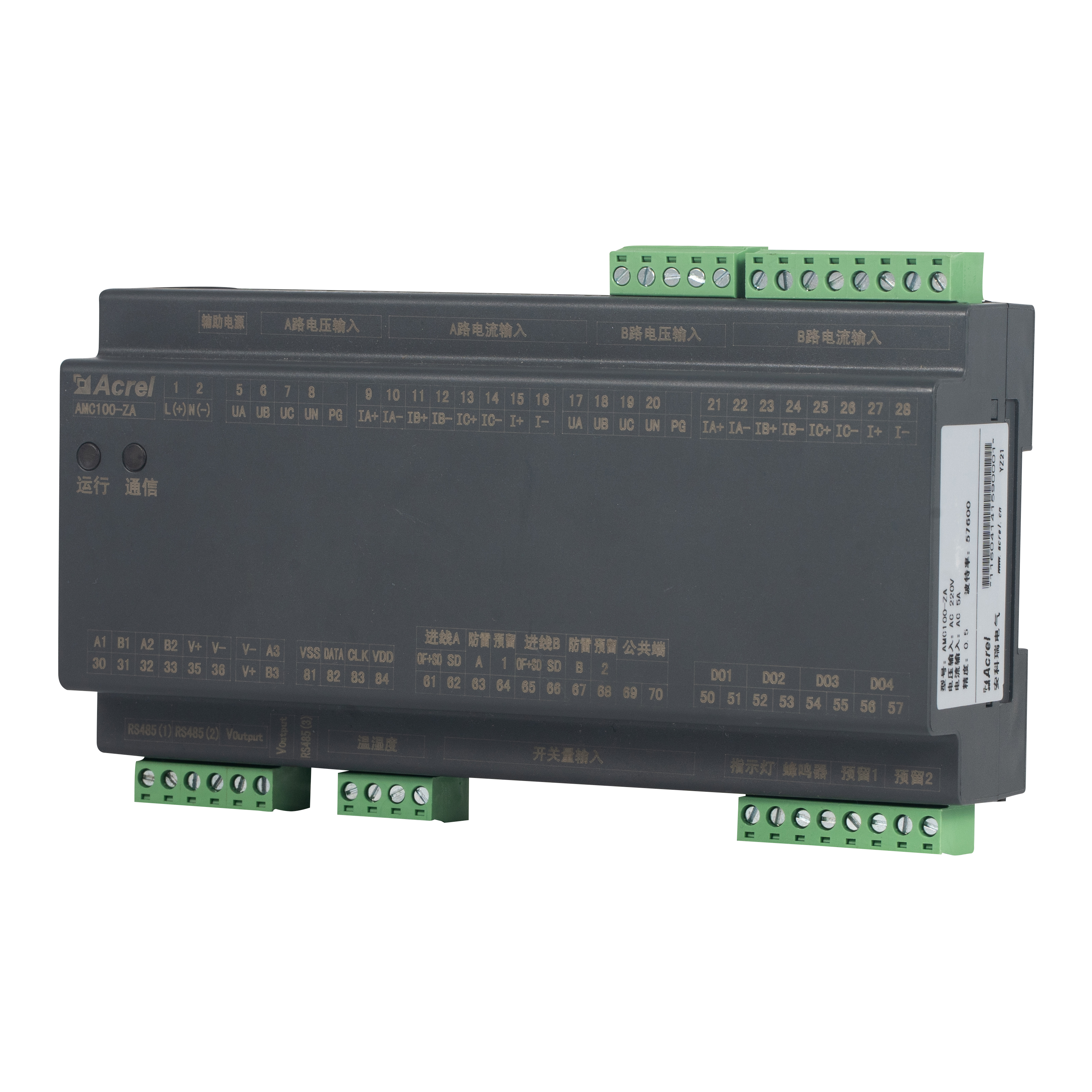 AMC100-ZA, Acrel'in veri merkezi sunucu rafları için tasarlanmış DIN raylı AC hassas güç dağıtımı izleme ünitesidir. A B çift üç fazlı beslemenin, 192 giden devrenin, 8 DI / 4 DO durum noktasının, 2 sızıntı kanalının, 1 sıcaklık-nem sensörünün ve 63 harmoniğin tüm elektriksel parametrelerini eş zamanlı olarak takip eder. Üç RS485 Modbus-RTU bağlantı noktası kusursuz BMS/DCIM entegrasyonunu sağlar. Kompakt 180 mm muhafaza, ±%0,5 doğruluk, kanal başına alarm eşikleri ve anında sesli ışık uyarısı, enerji israfını ve kesinti süresini azaltarak onu yeşil veri merkezi AC veri yolu veya PDU izleme çözümlerinin ölçeklenebilir kalbi haline getirir.