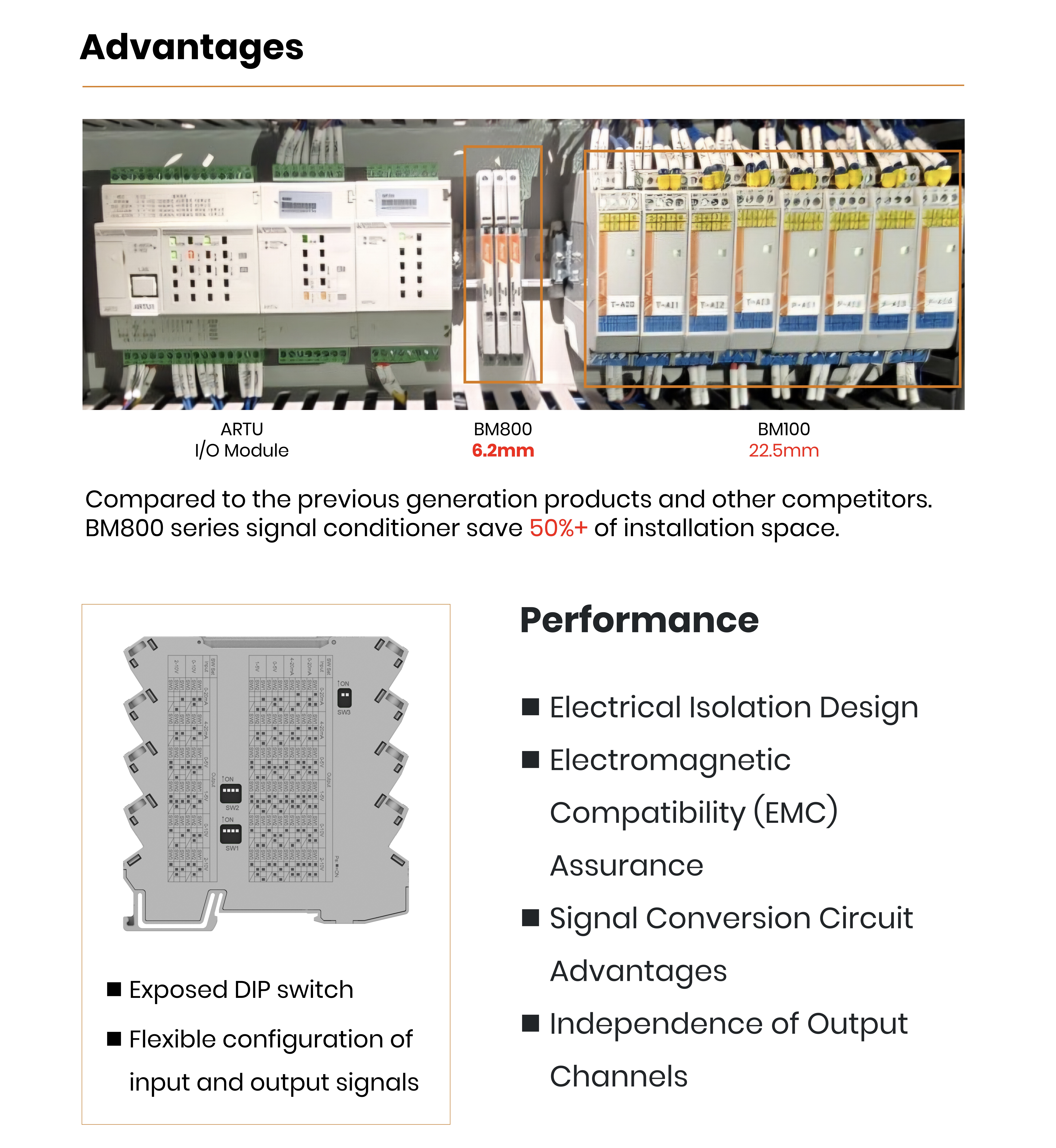Sinyal İzolatörleri, Sinyal Dönüştürücüleri ve Sinyal Dönüştürücüleri olarak da bilinen BM800 Serisi Sinyal Koşullandırıcı, süper ince 6,2 mm tasarıma sahip, kurulum alanından %50'den fazla tasarruf sağlayan gelişmiş bir endüstriyel sinyal koşullandırma cihazıdır. %0,1 doğruluk, elektromanyetik uyumluluk güvencesi ve elektriksel izolasyon, sinyal dönüştürme devresi avantajları ve bağımsız çıkış kanalları gibi özelliklere sahiptir. Esnek giriş ve çıkış sinyali konfigürasyonu için bir DIP anahtarıyla 0/4~20mA, 0/1~5V vb. gibi çeşitli sinyalleri işleyebilir. Ayrıca sıcaklık sapması, tepki süresi ve yalıtım gücü açısından mükemmel performansa sahiptir.